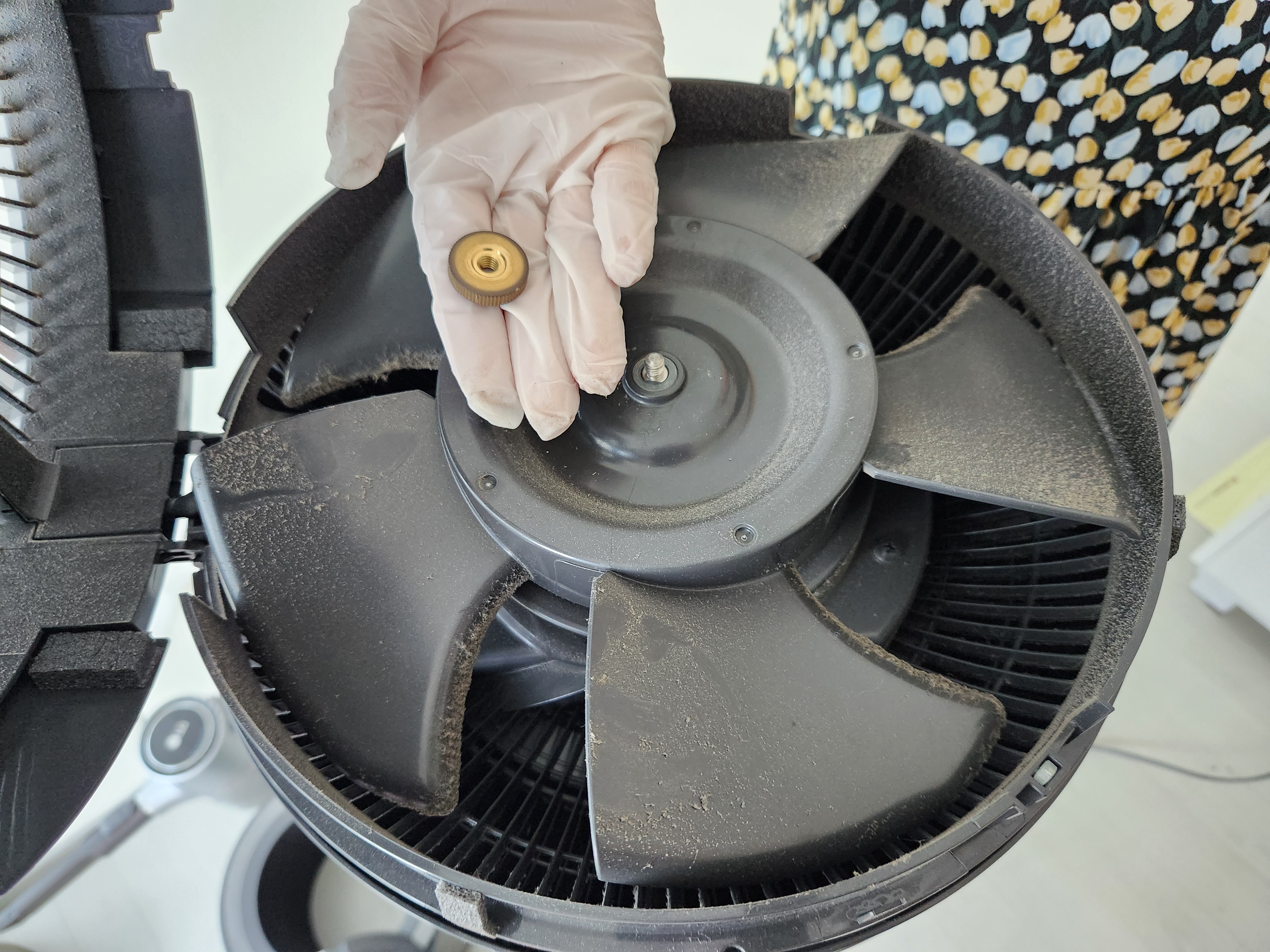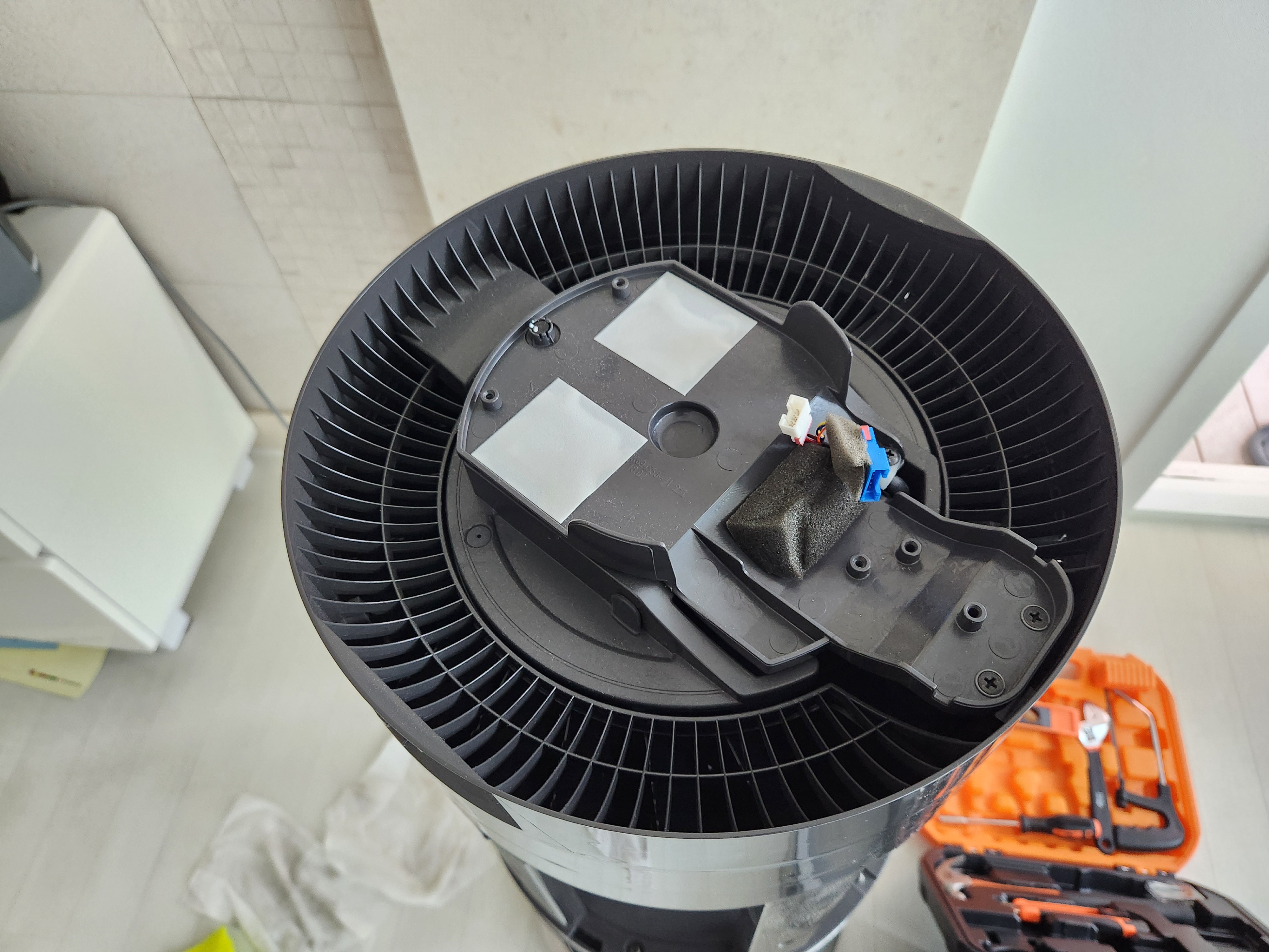 옆면에 볼트 2개를 제거하셨으면 위 사진처럼 커버를 들어 올리실 수 있습니다. 사진처럼 보이시는 공기청정기 팬은 가운데에 있는 금속재질의 와셔를 풀어주시면 들어 올리실 수 있습니다.